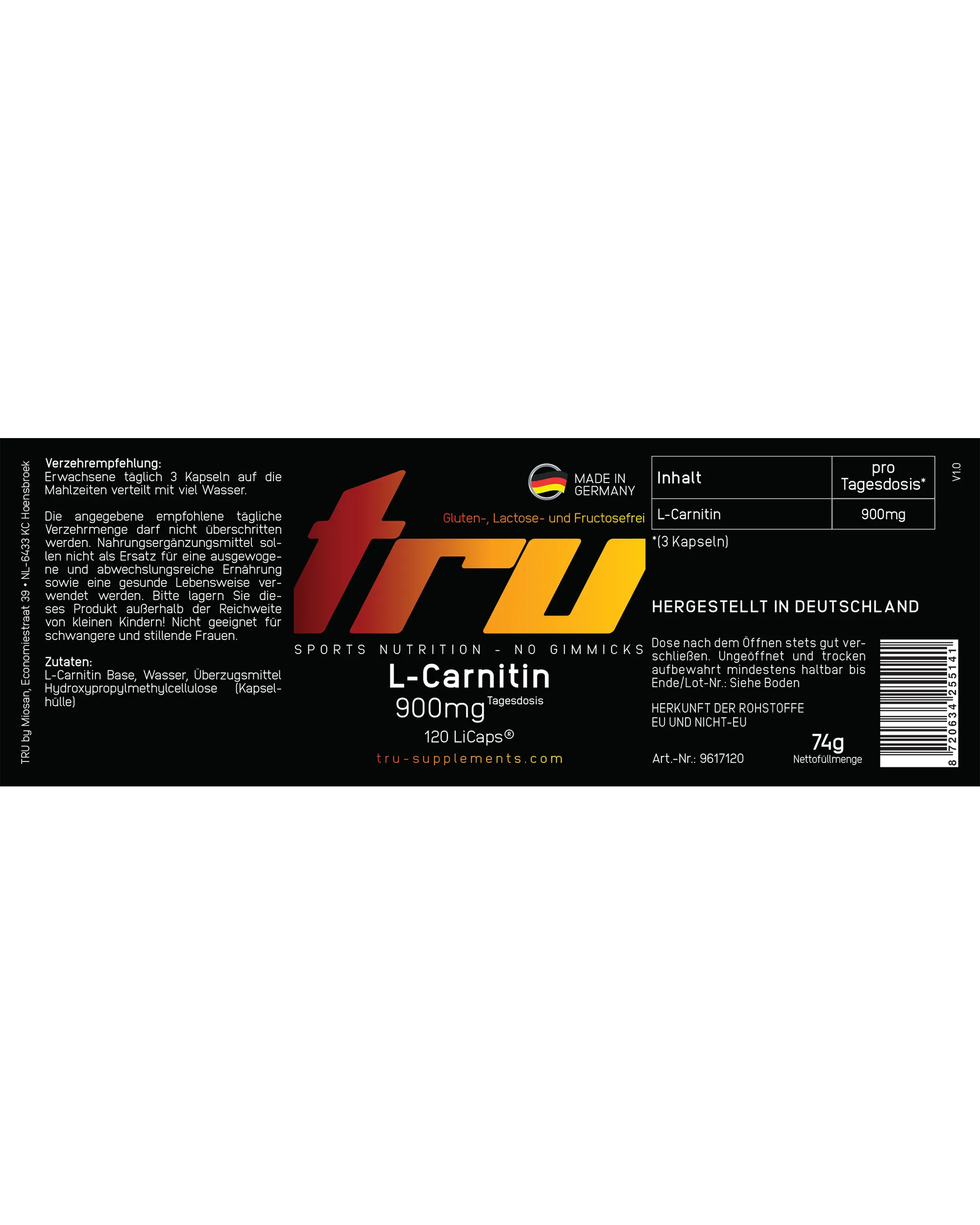 TRU L-Carnitin enthält hochwertiges L-Carnitin in flüssiger Kapselform (LiCaps®), die für eine optimale Dosierbarkeit und einfache Einnahme entwickelt wurde. Jede Tagesdosis liefert 900 mg L-Carnitin.